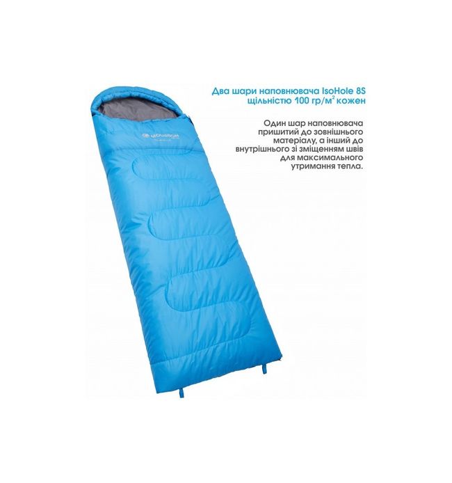 Mousson Tour Blue Left - Серія спальних мішків виконана в популярній конструкції «ковдра з капюшоном» та буде найбільш комфортною у використанні за температури -2°С для жінок та -7°С для чоловіків. За потреби спальний мішок повністю розстібається та стає ковдрою. Чудово підійде людям зі зростом до 195 см. Внутрішній наповнювач IsoHole 8S з ідеально підібраною кількістю шарів та щільністю надійно утримує тепло і при цьому пропускає повітря, легко відновлює форму після стискання. Наповнювач IsoHole 8S завдяки своїм особливостям: