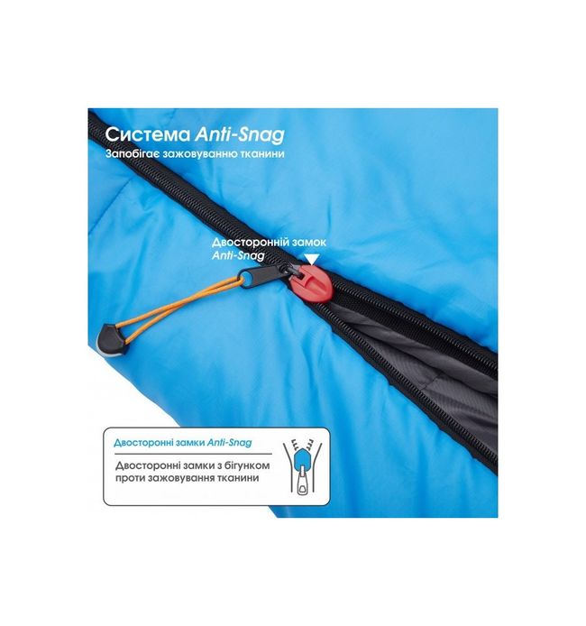 «Антизакусуючий» захист блискавки: область вздовж блискавки прошита сітчастої тасьмою та / або забезпечена жорсткими елементами, щоб нейлоновий шар спальника не заминають і не застрявав в блискавки.
