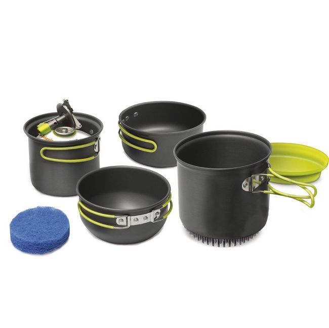В комплект входять дві каструлі, дві кришки і одна губка для миття. Поверхневий шар анодований, що надає виробам вогнестійкість, зносостійкість. Менша каструля поміщається у велику. Комплект забезпечує безпечне транспортування газових балонів і маленької конфорки.