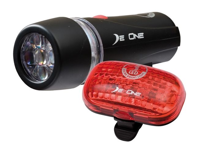 Набір велосипедних ліхтарів з економічним світлодіодним джерелом світла. Яскравий передній ліхтар (біле світло) 5 LED, який включає в себе три режими (постійне світло та два світлопульсуючих) і максимально видимий до 100 метрів задній ліхтар 3 LED (червоне світло) працює в 3 режимах освітлення. Набір живиться від шести батарей типу ААА (батареї в комплекті).