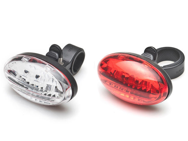 Набір велосипедних ліхтарів з економічним світлодіодним джерелом світла. Яскравий передній ліхтар (біле світло FN-5P ) 5 LED і максимально видимий до 500 метрів задній ліхтар 5 LED (червоне світло FN-5T ) працює в 3 режимах освітлення.