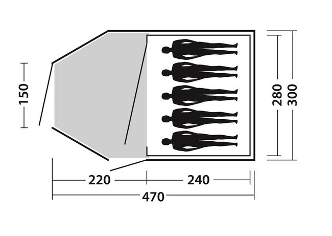 Велика вітальня і спальня в поєднанні з малим розміром упаковки робить цей намет ідеальним для туристів. Вхід здійснюється через передню і бічні двері. Два вікна роблять передпокій світлом і простором.