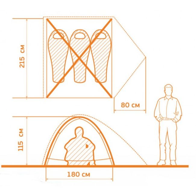 - Розмір внутрішнього намету: 215 х 180 х 115 см