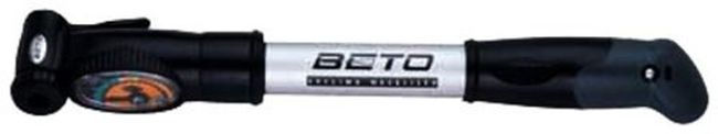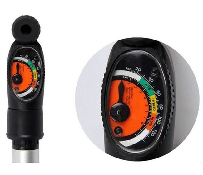 Алюмінієвий насос з манометром і Т-подібною пластиковою ручкою. Реверсивна головка для двох типів ніпеля: Presta, Schrader. Максимальний тиск 80 PSI.