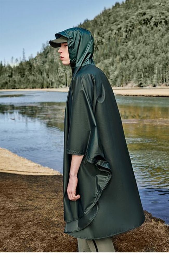 Дощовик має довгі рукави та каптур висотою 33 см. Попереду присутня широка кишеня, в якій можна носити найнеобхідніші речі, наприклад, смартфон або ключі. За бажанням модель можна використовувати не тільки як дощовик — є можливість розтягнути її як імпровізований тент для тимчасового укриття від дощу або постелити на землю, щоб облаштувати місце для пікніка.