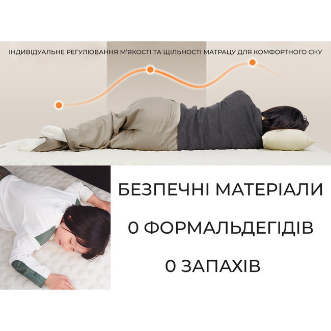 - Наповнювач з еластичної піни. Шар демонструє велику гнучкість, що дозволяє матрацу адаптуватися під вигини тіла для ефективнішої підтримки м'язів і максимального розслаблення. Матеріал також має високу компресійну здатність — він займає на 40% менше місця у складеному вигляді порівняно з аналогами з традиційної піни.