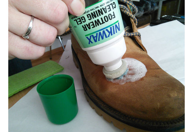 - промийте взуття чистою водою для видалення бруду та зволоження поверхні;