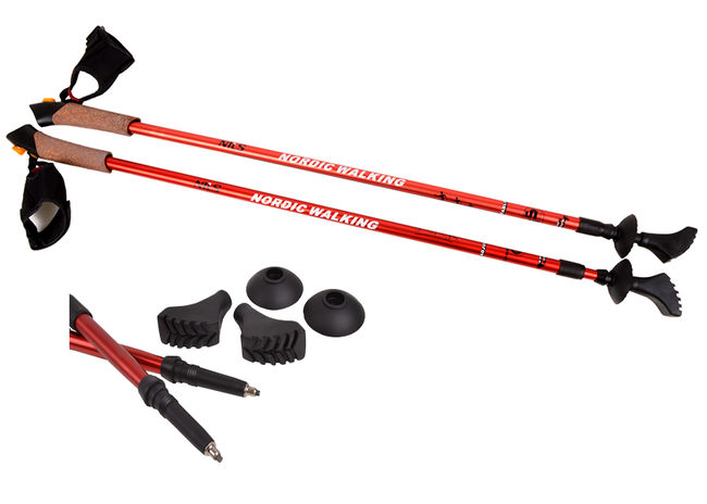 Палиці розсувні, складаються з двох секцій, відмінний дизайн і невелика вага, завдяки високоякісним матеріалам дозволяють займатися нордичної ходьбою. Палиці оснащені спеціальною ергономічною ручкою з EVA і PP. Вони забезпечують відмінне зчеплення на будь-якій місцевості. У комплекті є додаткові насадки для м'якого грунту. Зносостійкі наконечники з каучуку забезпечують комфорт на грунті або асфальті.