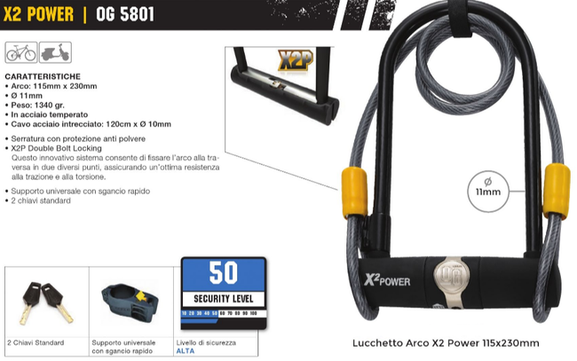 Onguard Arco X2 Power 5801 U-Lock Міцний U-подібний кодовий замок, який можуть використовувати кілька людей. Зроблений з армованої сталі та має захисне пластикове покриття для захисту рами від подряпин. Армована сталь підвищує опірність розрізанню.