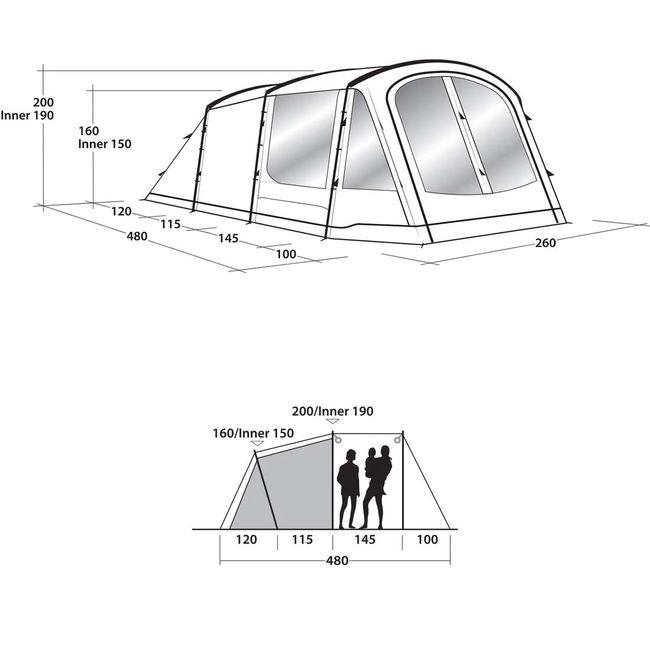 - Зовнішній тент (Д х Ш х В): 480 х 260 х 200 см