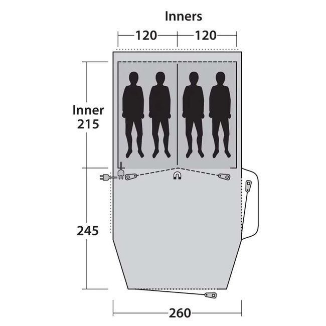 - Внутрішній намет (Д х Ш х В): 215 х 240 х 190 см