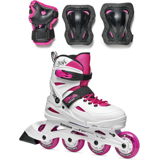 Rollerblade Fury Combo – дитячі ролики з регульованим розміром у комплекті із захистом. Легка лита конструкція забезпечує бічну підтримку для ролерів-початківців, а колеса діаметром 72 мм і жорсткістю 80A в парі з підшипниками SG3 забезпечують хороший баланс швидкості і контролю. Модель для дітей середнього віку та підлітків. Черевик регулюється натисканням кнопки не більше чотирьох розмірів. Регульований еластичний лайнер Performance Junior з розміром, що адаптується, для максимального комфорту протягом усього терміну використання роликових ковзанів. Комплект захисту складається з наколінників, налокітників та захисту зап'ясток. Анатомічна форма специфічна для правої та лівої сторони. Міцні пластикові частини захищають від подряпин, а сітчаста м'яка підкладка дихає і комфортно прилягає до тіла.