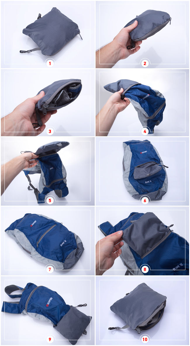 Нижче можна побачити, що цей компактний рюкзак легко складається в маленький гаманець і не менш легко з маленького гаманця розкладається в зручний рюкзак: розміри 40 х 26 х 17, в складеному стані 17 х 13 х 6 см.