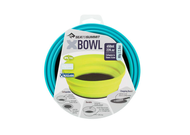 Sea To Summit X-Bowl Pacific Blue - Миска зі стінками з харчового силікону. Завдяки своїй конструкції компактно складається, стаючи плоскою, економить місце в рюкзаку. Підійде для холодних та гарячих страв. Дно миски виготовлено з міцного матеріалу Nylon 66, стійкого до подряпин і порізів, його можна використовувати як дощечку для нарізання.