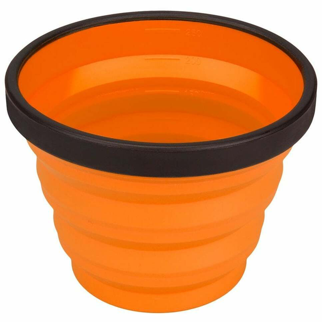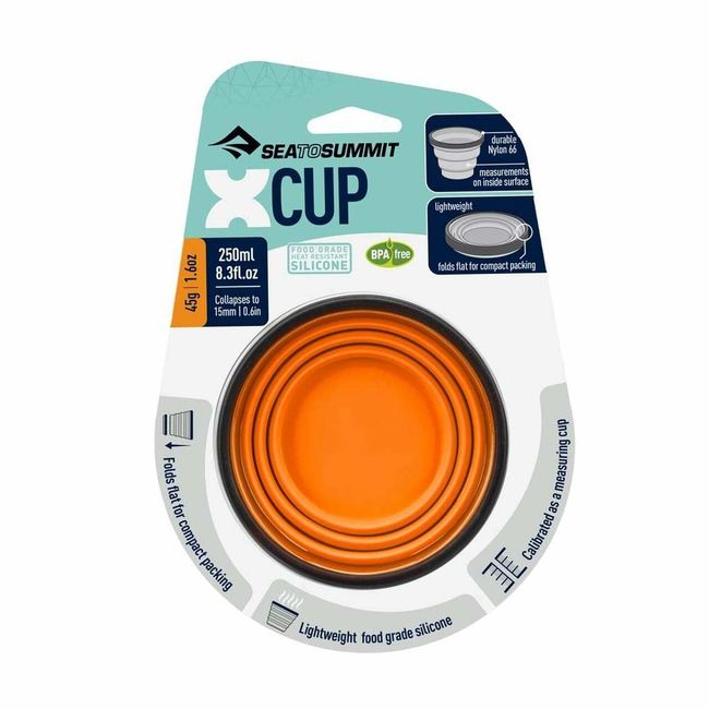 Sea To Summit X-Cup Orange — складна чашка зі стінками із силікону. Міцне кільце дозволяє утримувати форму. Економія місця і ваги в рюкзаку! Витримує температуру від -40 до +180 градусів Цельсія. На стінках горнятка висічена мірна шкала, що дозволяє використовувати її вдома в якості мірного стаканчика.