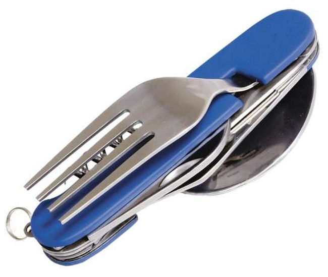 Набір компактний, займає мінімум місця, а його складові частини не загубляться. У складеному вигляді набір являє собою один предмет. У розкладеному вигляді це два багатофункціональні інструменти. У набір входить: вилка, відкривачка для пляшок і консервний ніж, штопор, ложка, шило, ніж.