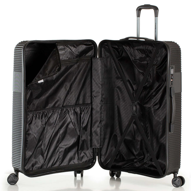 - Валіза має текстильну перегородку на блискавці, яка поділяє внутрішній простір на два основні відділення, перегородка має сітчасту кишеню на блискавці і дві відкриті кишені.