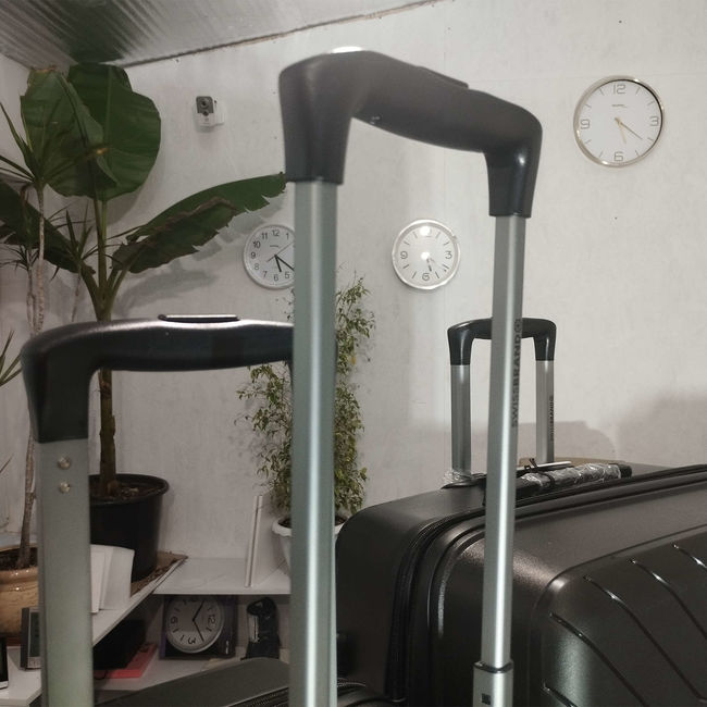 - ALUMINIUM TROLLEY - висувна телескопічна, алюмінієва ручка фіксується у двох положеннях. Для більшої надійності пластиковий верх ручки закріплений чотирма гвинтами. Телескопічна система повністю знімна, і у разі пошкодження може бути замінена.
