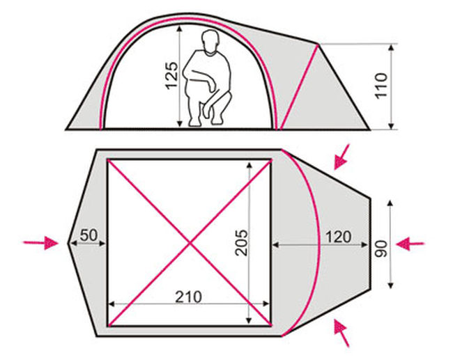 Два входи дають можливість прямого доступу в спальню і забезпечують ідеальну вентиляцію. Складна захисна "спідниця" перешкоджає можливому попаданню пилу, снігу тошо. Установка намету швидка і легка.