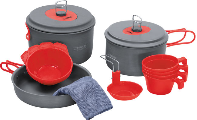 Terra Quatro - Набір посуду з анодованого алюмінію для 3-4 осіб, складається з двох казанків, кришки-сковорідки. До набору також входять комплект з мисок та чашок для чотирьох осіб, черпак та ганчірка для миття посуду. Набір упакований в зручний сітчастий чохол.