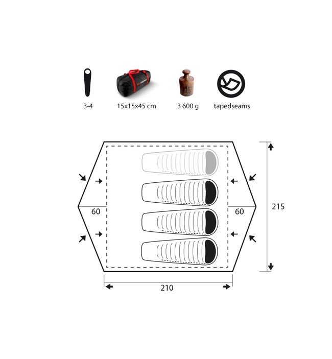 - Зовнішній тент і внутрішній намет: 100% поліестер
