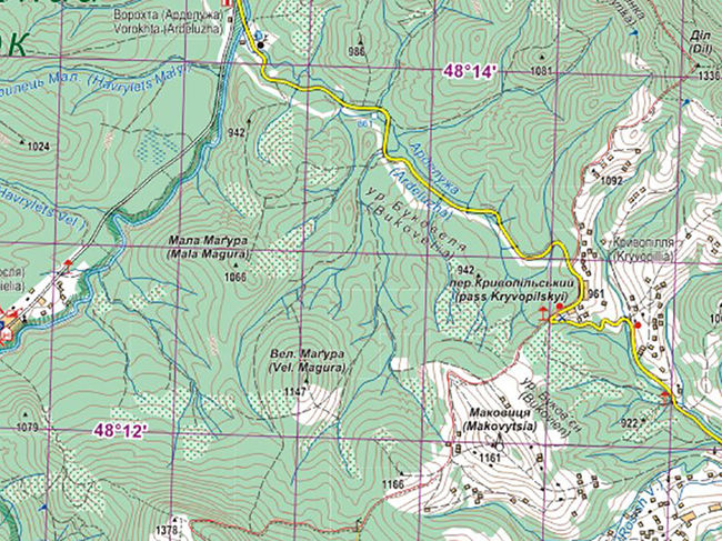 Схема покриття Карпат картами серії "Україна. Відпочивай активно!" в онлайн-режимі на Гугло-картах.