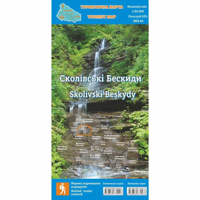 Туристична карта Сколівські Бескиди - У невеликому форматі карти подано тільки необхідну для активного туриста інформацію. Назви на карті подані українською та англійською мовами (транслітерація).