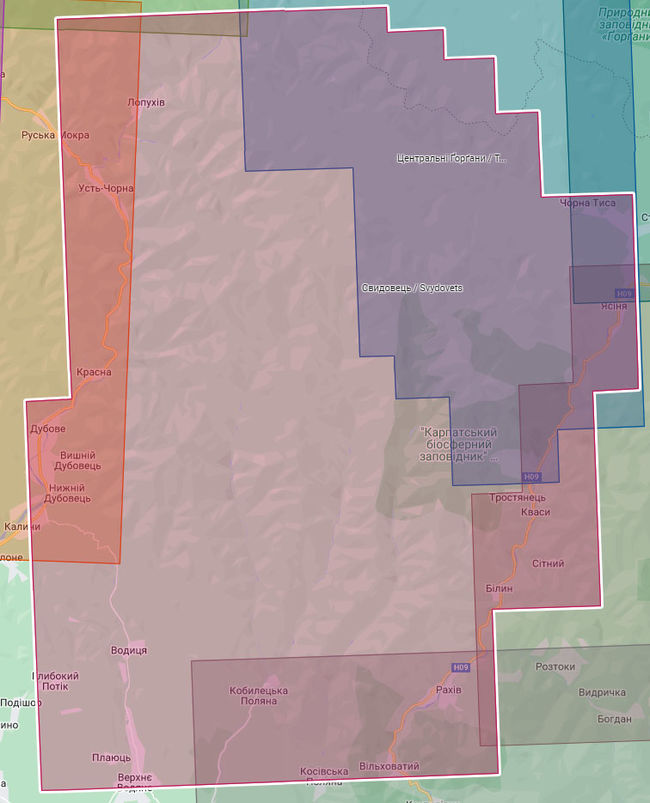 • населені пункти Рахів, Ясіня, Кваси, Кобилецька Поляна