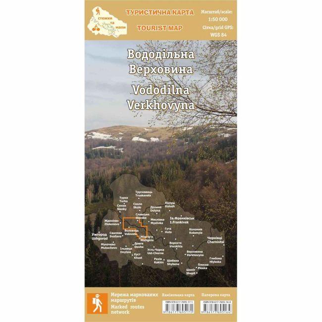 Туристична карта "Вододільна Верховина" - На карті нанесені помарковані на місцевості та плановані до ознакування пішохідні маршрути. Більшість з поданих територій перевірена власними виходами в гори. Дата видання карти — травень 2017-го року (актуалізація картографічної основи 2016-2017 рр).