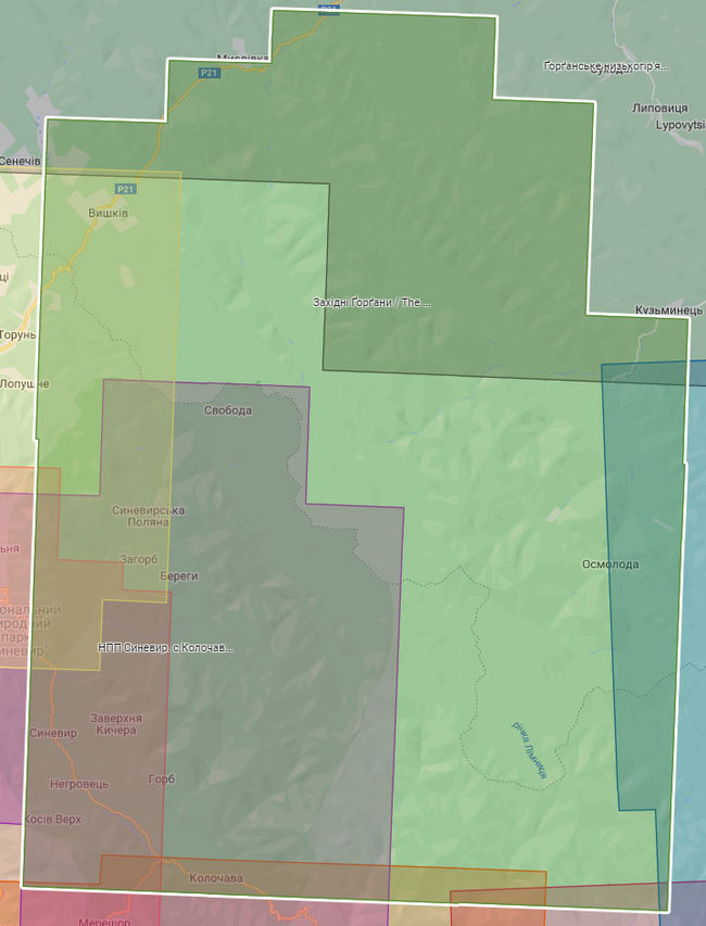Карта "Західні Ґорґани" включає гірські прикарпатські та закарпатські села Мислівка, Вишків, Осмолода, Синевир, Синевирська Поляна, Негровець та Колочава і прилеглі до них гірські масиви, з яких можна зійти також до сіл Торунь, Липовиця, Суходіл та Ілемня.