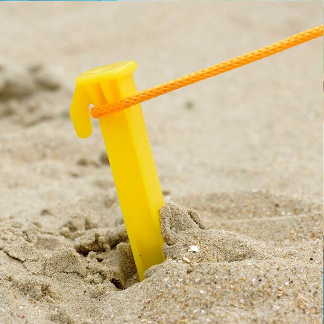 - Чотири відтяжки і 8 легких піщаних кілочків слугують для більш надійної фіксації намету на піску або іншому грунті.
