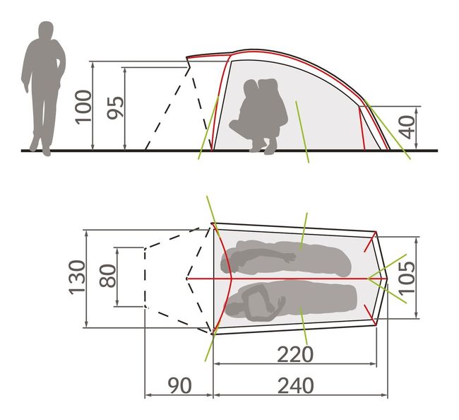 | Зовнішній тент | 40d 240T Ripstop (двостороння обробка силіконом) Нейлон (Polyamide), 3000 мм |
