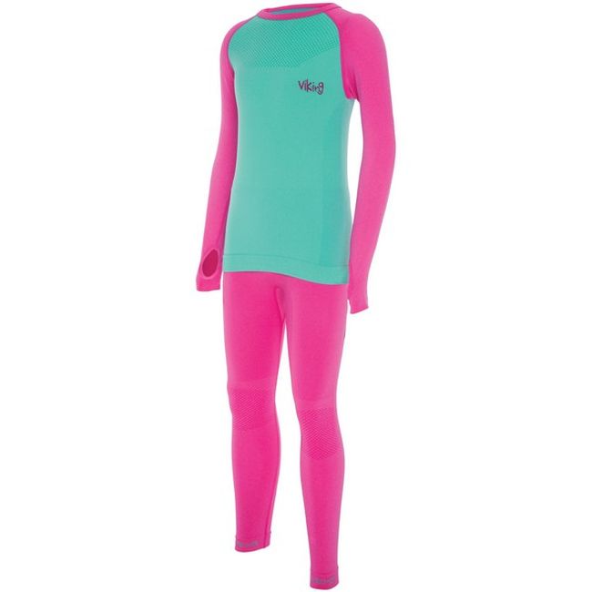 Viking Arata Set Turquoise Pink - Двокольорова дитяча термоактивна білизна, чудовий шар для зими як з точки зору активності, так і повсякденного одягу при низьких температурах. Приталений низ і верх, вкладка великого пальця і композиція матеріалу означають, що решта шарів комфортно ляжуть на блузку. Рукава не зморщуються і не тягнуться під толстовку або фліс, що є великою перевагою і комфортом при одяганні дітей.