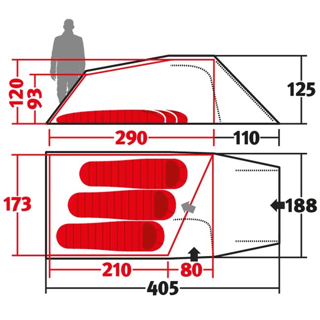 - Зовнішній намет (Д х Ш х В): 405 х 188 х 125 см