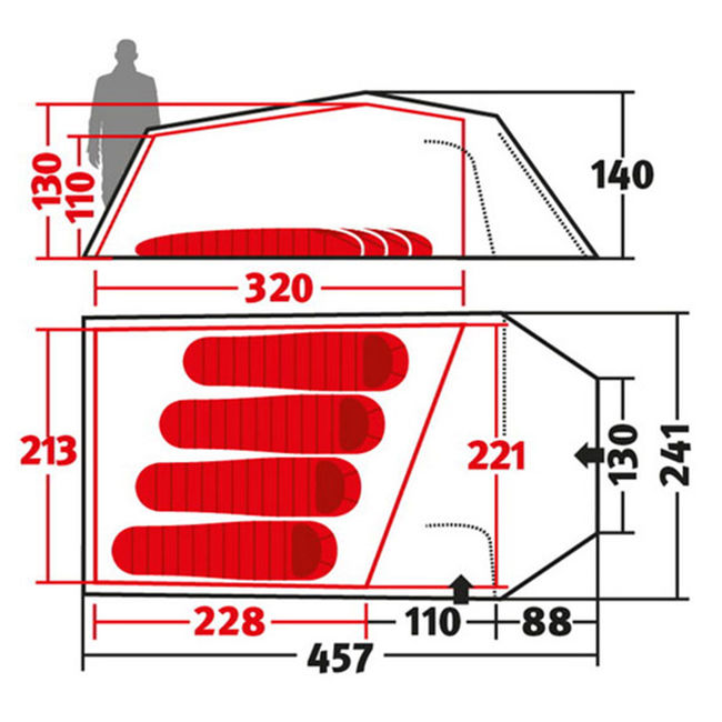 - Зовнішній намет (Д х Ш х В): 457 х 241 х 140 см