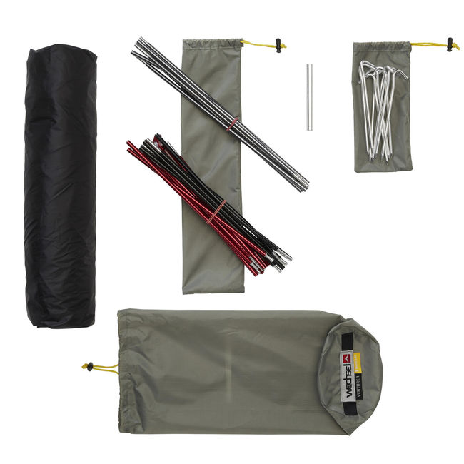 - Чохол намету має спеціальну конструкцію з подвійним кордом на стяжках. Це дозволяє упакувати намет звичайним чином, або більш компактно, коли дуги переносяться окремо. Чохол виконаний з того ж матеріалу, що і тент, відповідно є легким, міцним і надійно захищає вміст.