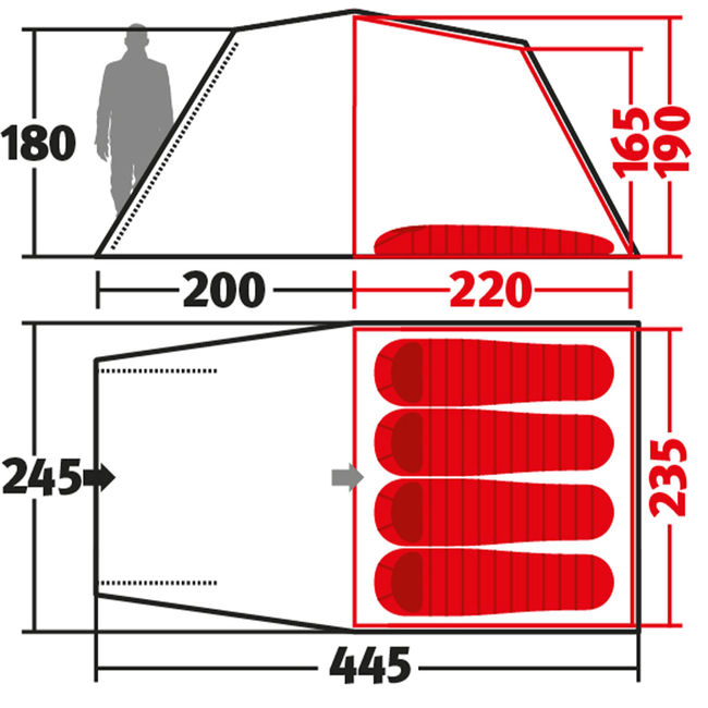 - Внутрішній намет (Д х Ш х В): 220 х 235 х 190 см