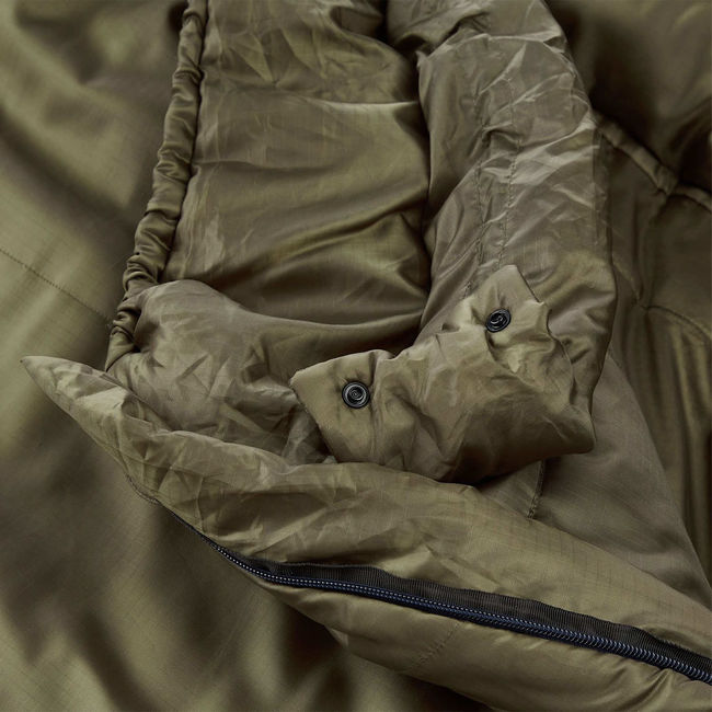 - В області шиї передбачений об'ємний комір, який закривається пластиковими кнопками, регулюється стяжкою і створює додатковий термоізоляційний бар'єр, що перешкоджає проникненню холодного повітря всередину спального мішка.