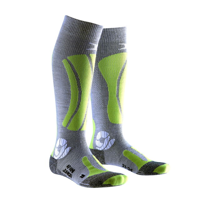 X-Socks Apani Socks Wintersports Junior — Дитячі високотехнологічні термошкарпетки з вовни Apani Merino - першої дійсно інтелектуальної вовни, яка забезпечує максимальний комфорт за холодних умов, не вбирає бруд та неприємні запахи. Шкарпетки оснащені волокном Mythlan®, яке ефективно відводить зайву вологу, завдяки чому забезпечує сухість та захищає від поширення мікробів і бактерій. Запатентовані зони вентиляції по всій поверхні забезпечують всі характеристики, щоробить ці шкарпетки ідеальними для будь-якого лижного туру.