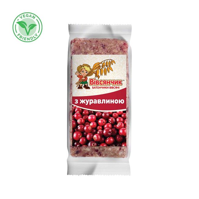 Харчі Батончик вівсяний з журавлиною, Вівсянчик ТМ - Склад: вівсяні пластівці, журавлина сушена, кокосове масло, глюкозно-фруктозний сироп. Виготовлено з натуральних продуктів без використання консервантів та ГМО