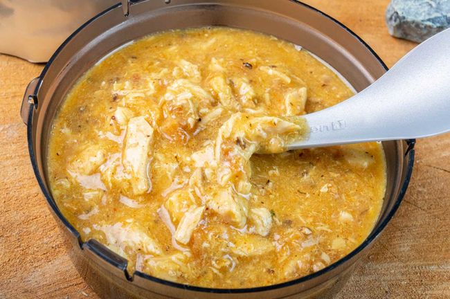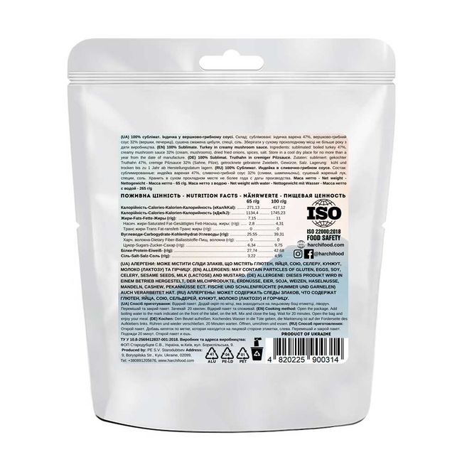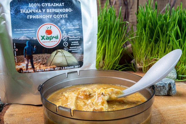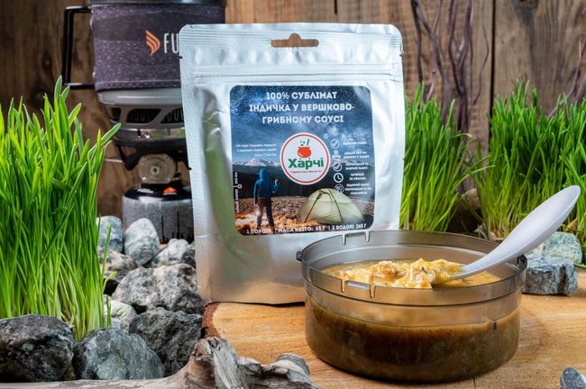 Харчі Індичка у вершково-грибному соусі - Склад: сублімовані: індичка варена 47%, вершково-грибний соус 32% (вершки, печериці), сушена смажена цибуля, спеції, сіль