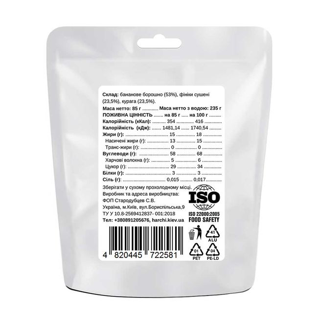Харчі Каша бананова з фруктами - Склад: бананове борошно (53%), фініки сушені (23,5%), курага (23,5%).