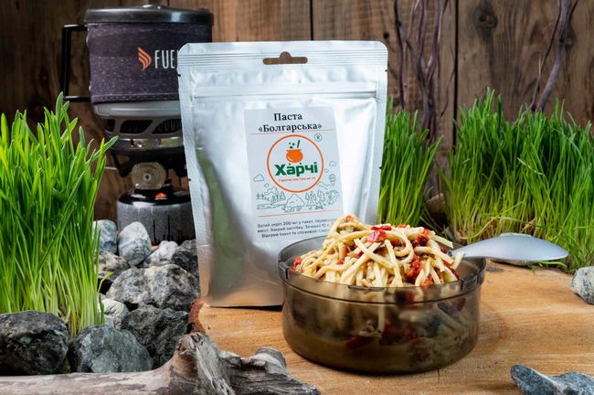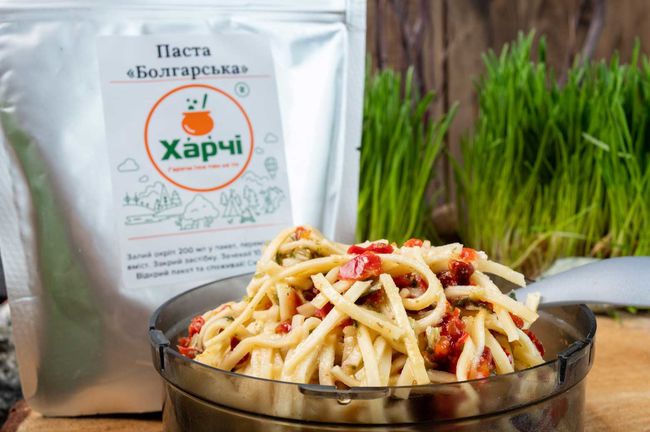 Харчі Паста «Болгарська» - Склад: локшина пропарена та сушена, сушені: болгарський перець (18%), сир, зелена цибуля; сіль.