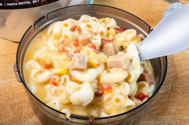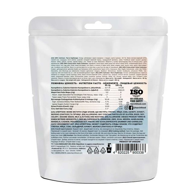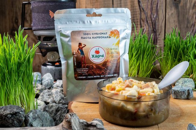 Харчі Паста Карбонара - Склад: сублімовані: варені макарони з твердих сортів пшениці (42 %), бекон копчено-варений (12%), сирний соус, кукурудза, яєчні жовтки; сушений, солодкий червоний перець, кукурудзяний крохмаль, суміш "Італійські трави” (сушені: душиця, базилік, чабер, цибуля, часник), чорний перець, сіль.