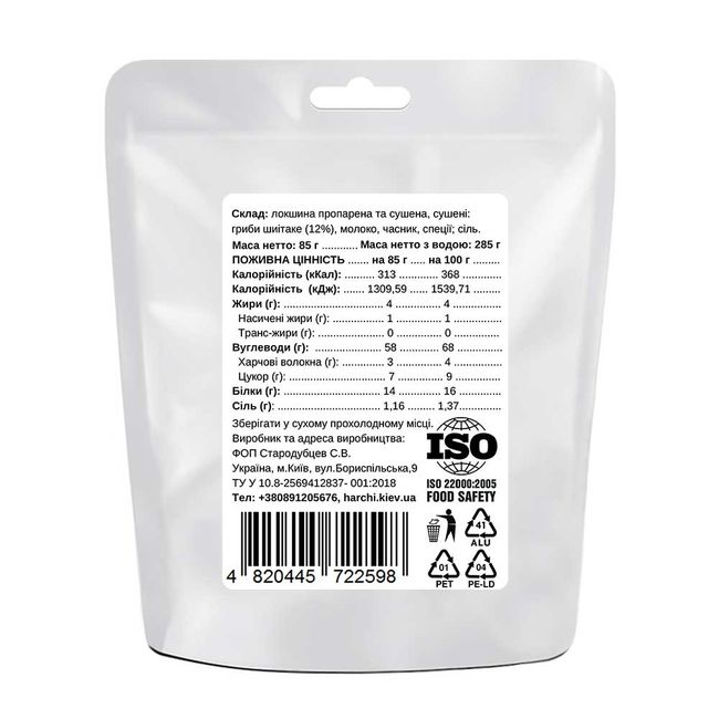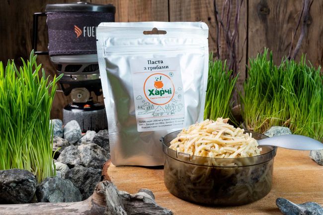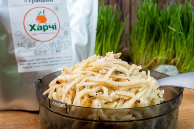 Харчі Паста з грибами - Склад: локшина пропарена та сушена, сушені: гриби шиітаке (12%), молоко, часник, спеції; сіль.