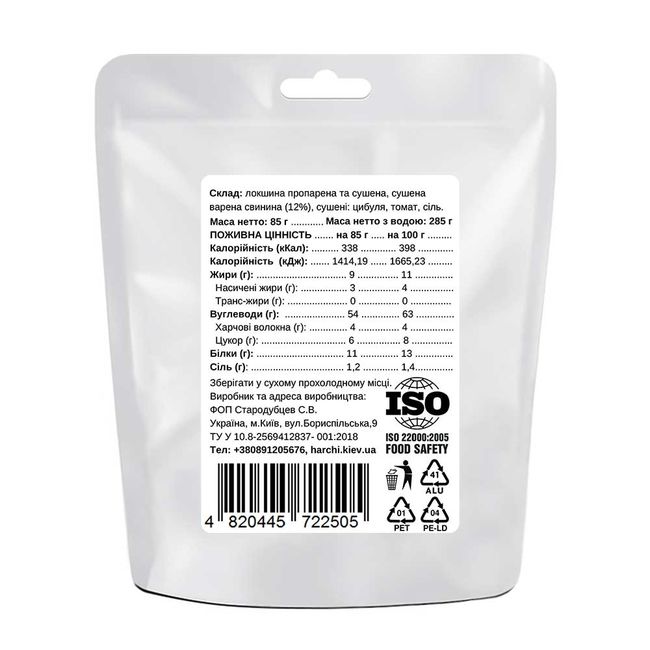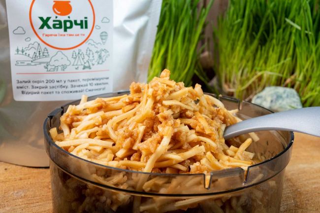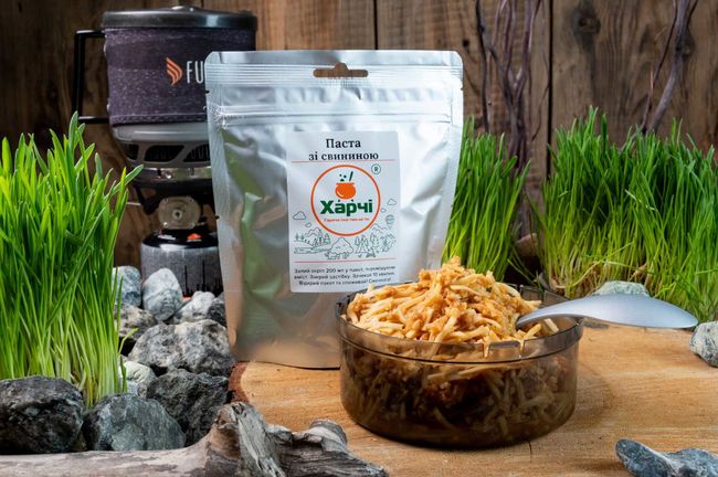 Харчі Паста зі свининою - Склад: локшина пропарена та сушена, сушена варена свинина (12%), сушені: цибуля, томат, сіль.