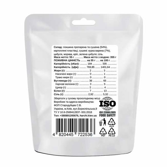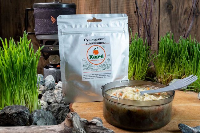 Харчі Суп курячий з локшиною - Склад: локшина пропарена та сушена (54%), картопляні пластівці, сушені: курка варена (7%), цибуля, морква, кріп, зелена цибуля; сіль.